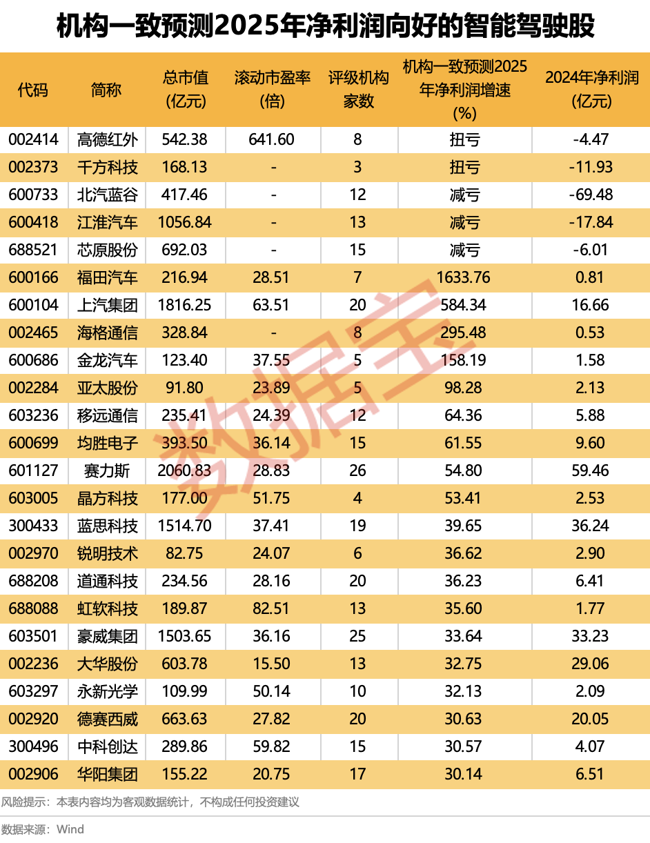 机构一致预测2025年净利润向好的智能驾驶股一览机构一致预测2025年净利润向好的智能驾驶股一览