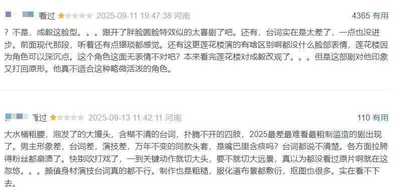 成毅的台词嘴型也是尴尬至极,就这么嘟嘟嘴、动动嘴皮子就讲完了台词,还以为他是在润嘴唇而已。